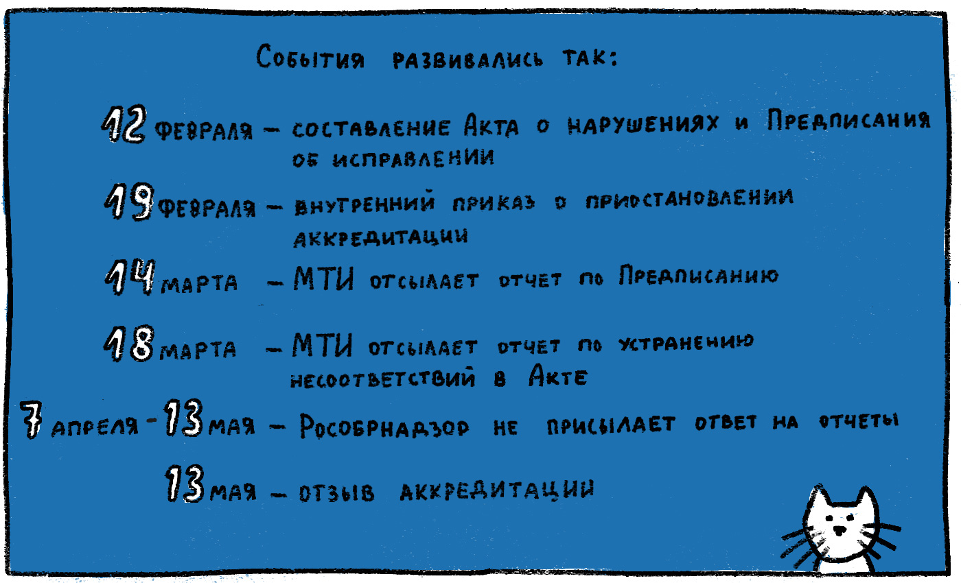 С 7 апреля по 13 мая Рособрнадзор должен был прислать ответ на отчеты, отправленные МТИ, однако никакого ответа от ведомства нет до сих пор. 13 мая на сайте Рособрнадзора появилась новость об отзыве государственной аккредитации у Московского технологического института.