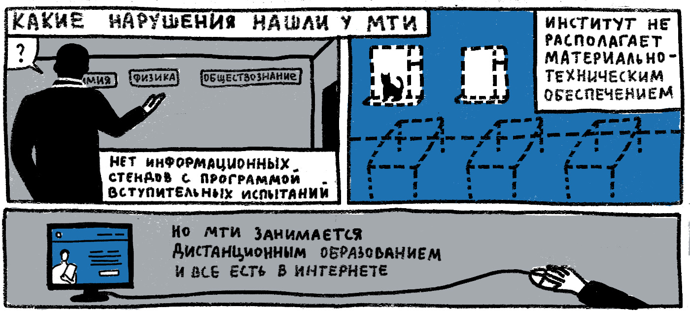 13 мая Рособрнадзор лишил аккредитации Московский технологический институт. По просьбе МТИ «Медиазона» рассказывает, какие нарушения нашли у вуза и какие нарушения допустил сам Рособрнадзор.