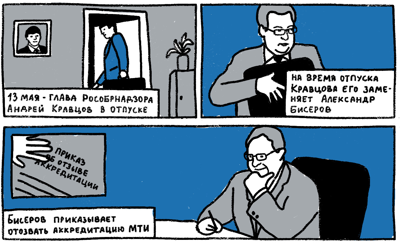 Приказ об отзыве аккредитации у МТИ был подписан заместителем главы Рособрнадзора Александром Бисеровым в то время как начальник федеральной службы Сергей Кравцов находился в отпуске.