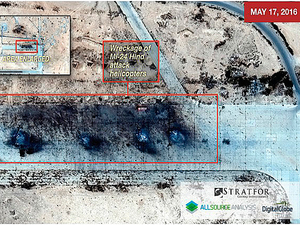 Снимок с сайта. Фото: stratfor.com Американская разведывательно-аналитическая компания Stratfor распространила информацию о том, что используемая российскими войсками авиабаза в Сирии серьезно пострадала. На фото видны обгоревшие остовы вертолетов Ми-24, обгоревший самолет Миг-25, предположительно принадлежащий Сирии. Между тем в Минобороны РФ опровергли уничтожение российских боевых машин.