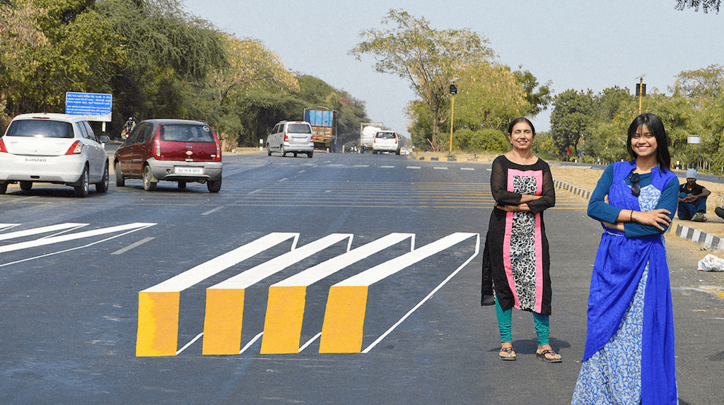 За 2014 год на дорогах Индии погибло более 139 тысяч человек, почти 40% – из-за превышения скорости. Мама и ее дочь сделали 3D-зебры по заказу местной компании, которая управляет дорожным хозяйством в Ахмедабаде, пятом по величине городе в Индии.