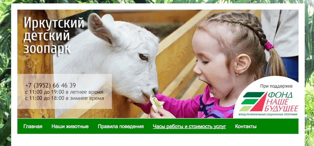 - Детский контактный зоопарк создан при поддержке фонда «Наше будущее». Главная идея проекта в том, чтобы дать детям навыки общения с домашними и экзотическими животными. В зоопарке работает благотворительная программа опекунства над животными, а также сформирована мобильная группа животных и организованы выездные экскурсии в учреждения социального обслуживания детей с ограниченными возможностями здоровья. Территорию зоопарка также планируется обустроить специальными дорожками и пандусами для беспрепятственного посещения детей.