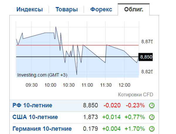 Котировки облигаций в режиме реального времени. Источник: ru.investing.comВо-вторых, такие действия Минфина могут помочь частным российским заемщикам. Стоимость облигаций, что логично, точно отражает ожидания рынка относительно дефолта заемщика. Как правило, если национальное правительство не способно платить по своим долгам, то и частные корпорации чувствуют себя не лучше — поэтому коммерческим компаниям проще размещаться, если известно, что их правительство является надежным заемщиком.