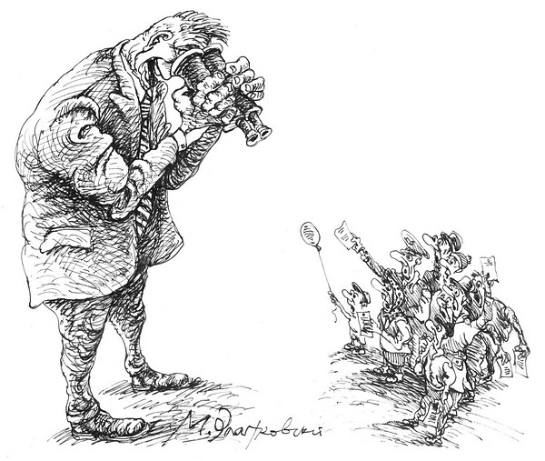 …Ты вот что, товарищ. Ты давай не умничай. Тихо ступай к своему креслу у телевизора, тебе нарисуют. Неужто не чуешь, как вместе со всеми поднимаешься с колен вопреки проискам врага? Не испытываешь прилива богатырских сил?! Нехорошо! Смотри, как бы не пришлось вызывать бригаду скорой помощи с аппаратом искусственного идейного вскармливания…