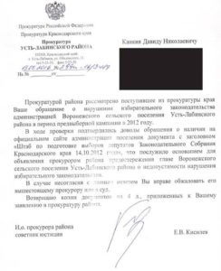 Движение «Голос» получило ответ прокуратуры Усть-Лабинского района Краснодарского края по поводу публикации на сайте Воронежского сельского поселения документа «Штаб по подготовке выборов депутатов Законодательного собрания Краснодарского края 14 октября 2012 года».