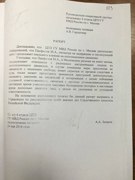 В документе отмечается, что Панфилов не имеет жилья в Москве, "поддерживает отношения с радикально настроенными лицами из оппозиционного движения, а также "может продолжить заниматься преступной деятельностью".