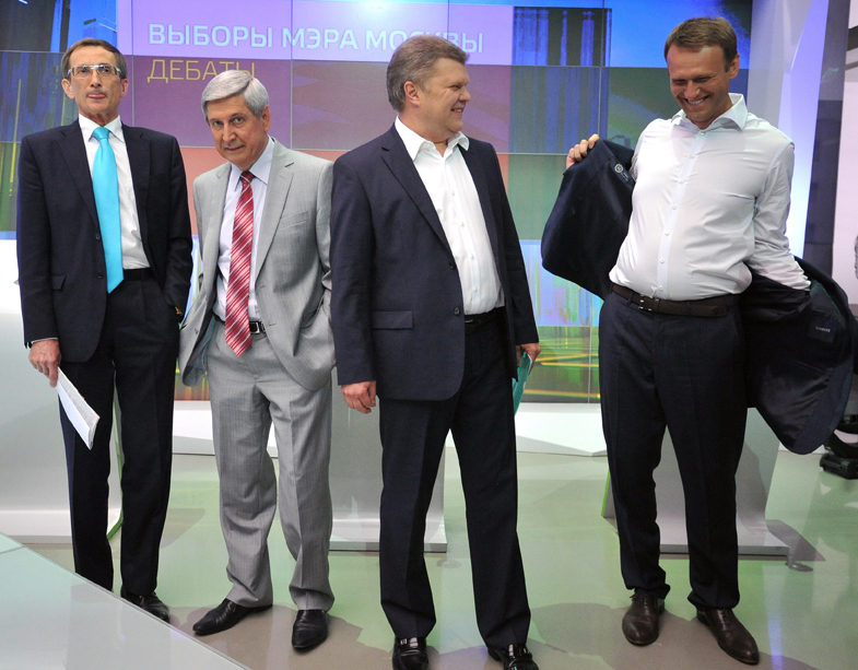 На выборах мэра Москвы Алексей Навальный (справа) назвал Сергея Митрохина из «Яблока» (второй справа) «кандидатом-спойлером», Москва, 16 августа 2013 года