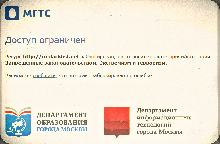 О факте блокировки мы узнали еще в прошлом году из неоднократных обращений пользователей сайта, которые были лишены доступа к нему. Более того, одновременно с необоснованным ограничением доступа к сайту, о нашем информационном ресурсе распространяется несоответствующая действительности информация, которая порочит деловую репутацию коллектива «РосКомСвободы». При попытке перехода на страницу сайта rublacklist.net в сетях московских образовательных учреждений вместо него пользователь перенаправляется на страницу «заглушки» оператора связи МГТС, которая содержит информацию о том, что сайт заблокирован, т.к. «относится к категориям Запрещенные законодательством, Экстремизм и терроризм».