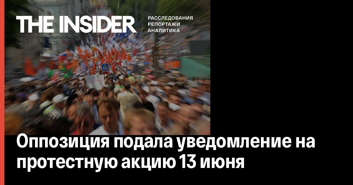 Сегодня было подано уведомление на проведение массовой протестной акции в Москве, запланированной на 13 июня. Среди участников Движение «Солидарность», ПАРНАС, Комитет протестных действий, Партия 5 декабря, Яблоко и др.).