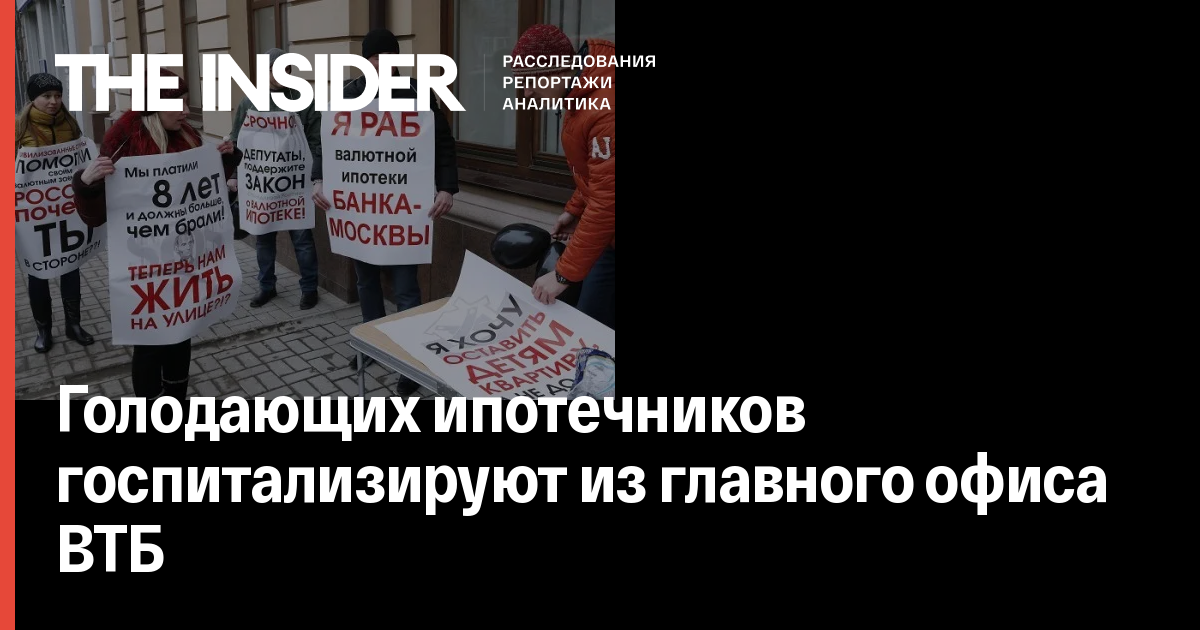 Валютных ипотечников, шестые сутки голодающих в офисе банка ВТБ24 в Башне Федерации комплекса «Москва-Сити», начали госпитализировать, пишет FlashNord со ссылкой на представителя движения валютных заемщиков Галину Григорьеву.