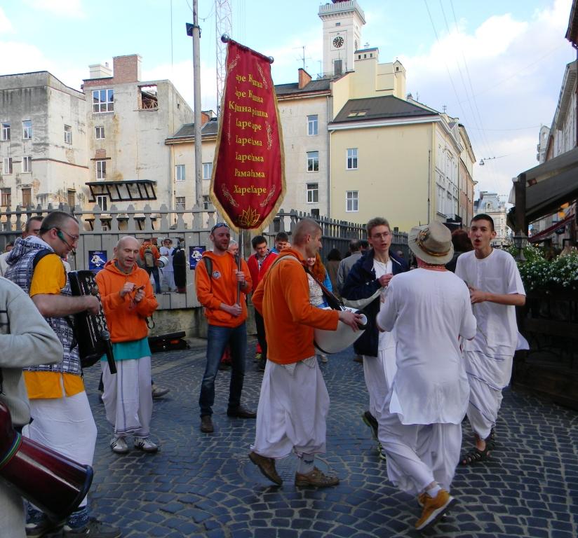 Но встречались люди в совсем других нарядах. Например, юбилей города праздновали почему-то и кришнаиты.