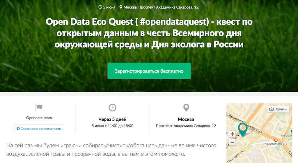 5 июня 2016 года в Москве пройдет Open Data Eco Quest, к участию в котором приглашаются все желающие. Мероприятие посвящено Всемирному дню окружающей среды и Дню эколога в России.