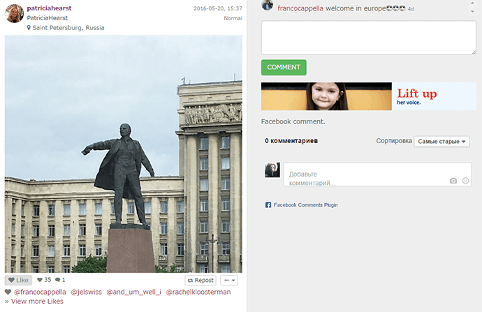 Патрисия Хёрст — внучка Уильяма Рэндольфа Хёрста, американского миллиардера и газетного магната, бывший член американской леворадикальной террористической группировки Симбионистская армия освобождения по кличке Таня — на днях посетила Санкт-Петербург. Дмитрий Мишенин узнал это не из СМИ, а из её личного Инстаграма. «O tempora, o mores!» — написал он в своём Фейсбуке и решил исправить положение дел, рассказав о том, кто же побывал в культурной столице и остался практически незамеченным.