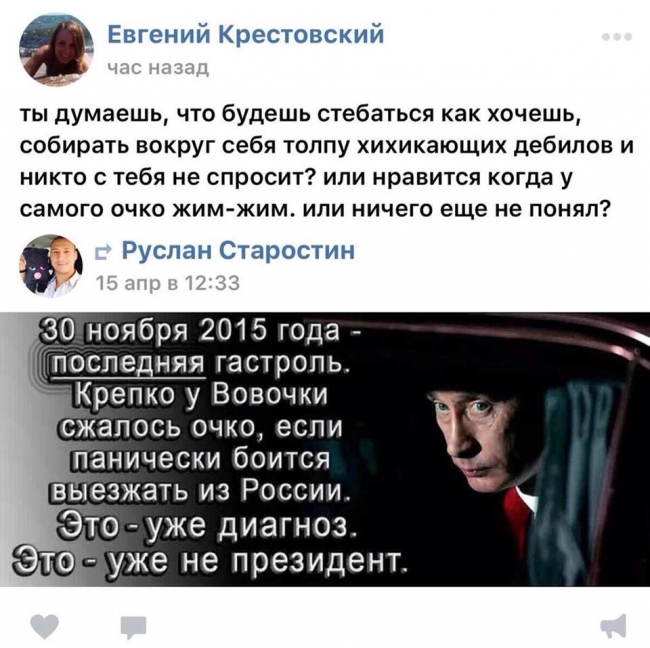А на следующий день, 20 апреля, все по стандартной схеме: объявился в соцсети некий Евгений Крестовский (в качестве аватарки фейковой страницы – фото супруги Руслана Анастасии). Поскольку у обоих супругов установлена фильтрация (сообщения могут писать только друзья), то «Крестовский» отправил им запросы. Логично рассчитывая на то, что, прежде чем одобрить желающего «дружить», пара заглянет в аккаунт автора заявки. Как только Руслан вошел на страницу, он прочитал на стене: «Ты думаешь, что будешь стебаться как хочешь, собирать вокруг себя толпу хихикающих дебилов и никто с тебя не спросит? Или нравится, когда у самого очко жим-жим, или ничего еще не понял?» Ниже фото его жены на отдыхе (взято со страницы Анастасии) и подпись: «Была счастлива деваха, пока муж с ума не сошел». Далее перепост какой-то незначительной записи со страницы девушки и вопрос: «Готова ли ты ради комплексов мужа идти с ним на баррикады его тщеславия?»