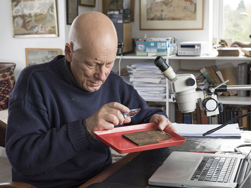 Энди Чоппинг (Музей археологии Лондона) изучает табличку при помощи прибора, дающего направленный свет
