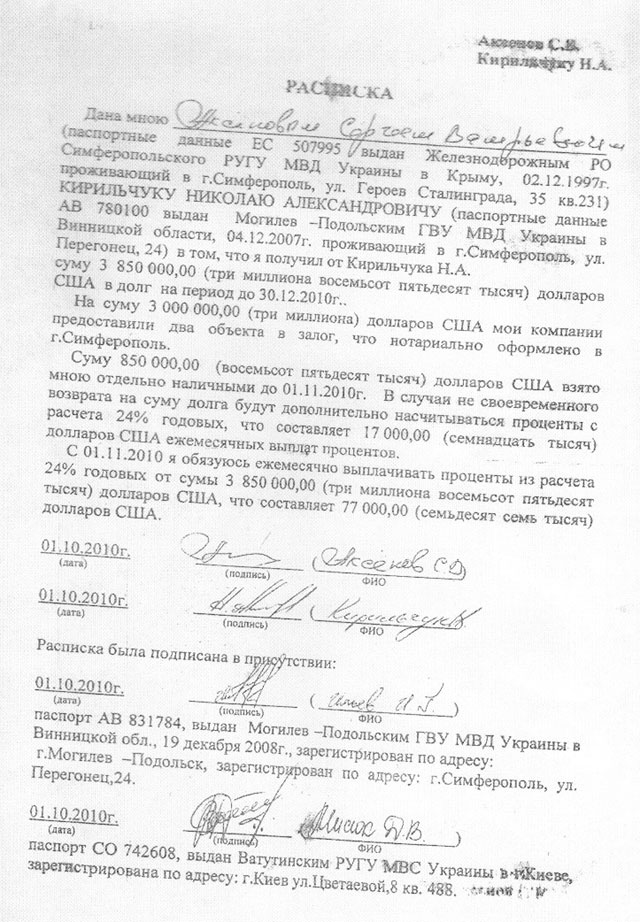 Между тем речь в публикации шла о кредитах, которые Сергей Валерьевич брал еще на заре своей политической карьеры, занявшись проектом «Гражданский актив Крыма». Тогда, в кризисном 2008 году, получить банковский кредит было весьма сложно. Возможно, поэтому бизнесмен Аксенов (официально в те годы он числился замдиректора ООО «Фирма «Эскада») обратился к своему земляку Николаю Кирильчуку (оба уроженцы города Бельцы Молдавской ССР), который как раз перебрался на Украину и получил украинское гражданство. Спустя два года, когда Кирильчук возглавил Министерство промышленной политики Крыма, а Аксенов избрался в Верховную раду Крыма, долг депутата перед министром, по данным СМИ, вырос в общей сложности до $3,85 млн (см. скан расписки от 1 октября 2010 года с подписями должника и кредитора — фото 1). Наличие долговых обязательств Аксенова подтверждается и решением Центрального районного суда Симферополя от 9 октября 2012 года, которое обязывало нынешнего главу Крыма выплатить порядка 35 млн гривен.