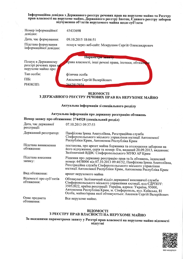 К моменту аннексии Крыма Сергей Аксенов имел не только значительные финансовые трудности, но и оказался фактически банкротом: его имущество, будь оно найдено, немедленно оказалось бы под арестом. Об этом свидетельствуют данные украинского реестра имуществен-ных прав на недвижимость, обнаруженные в апреле 2016-го (см. информацию из официального реестра имущественных прав на недвижимость — фото 2). Редакция обратилась за комментарием в пресс-службу главы Крыма. На момент подписания номера в печать ответа из Симферополя не последовало.