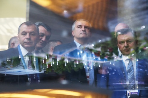 Владимир Константинов(крайний слева) и Сергей Аксенов (справа) на открытии экономического форума в Ялте, 14 апреля 2016 года
