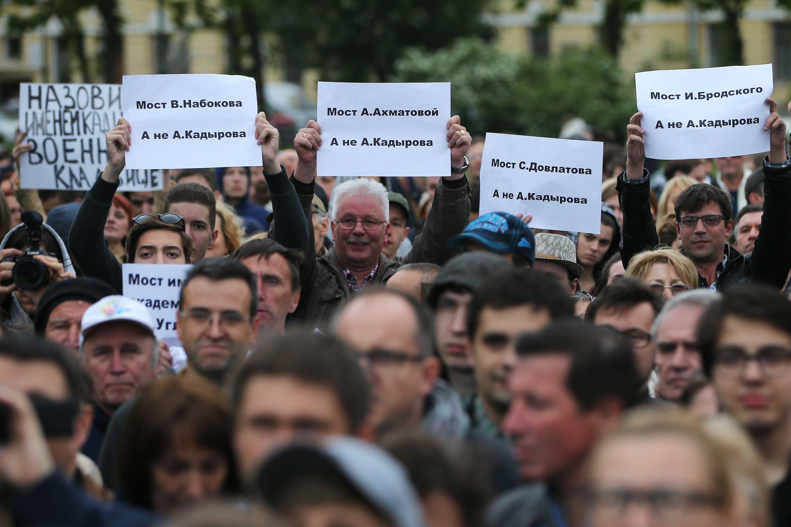 На Марсовом поле в Санкт-Петербурге собрались сотни людей. Многие держали в руках плакаты: «мост Героев», «Жемчужный мост», «мост Мира». Такие названия участники акции предлагали для моста, которому петербургские чиновники хотят присвоить имя президента Чечни в 2003-2004 годах Ахмата Кадырова.