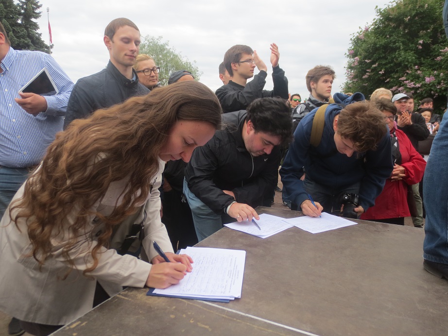 На протяжении всего митинга собравшиеся на Марсовом поле подходили к трибунам, на которых были разложены подписные листы, и ставили там свои подписи. В общей сложности только за час митинга было собрано почти полторы тысячи подписей, которые вместе с подписями в интернете будут переданы губернатору Петербурга.