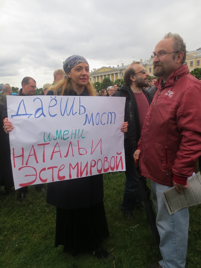 Авторы плакатов предлагали также назвать мост именами убитых правозащитников — Натальи Эстемировой, Анны Политковской.