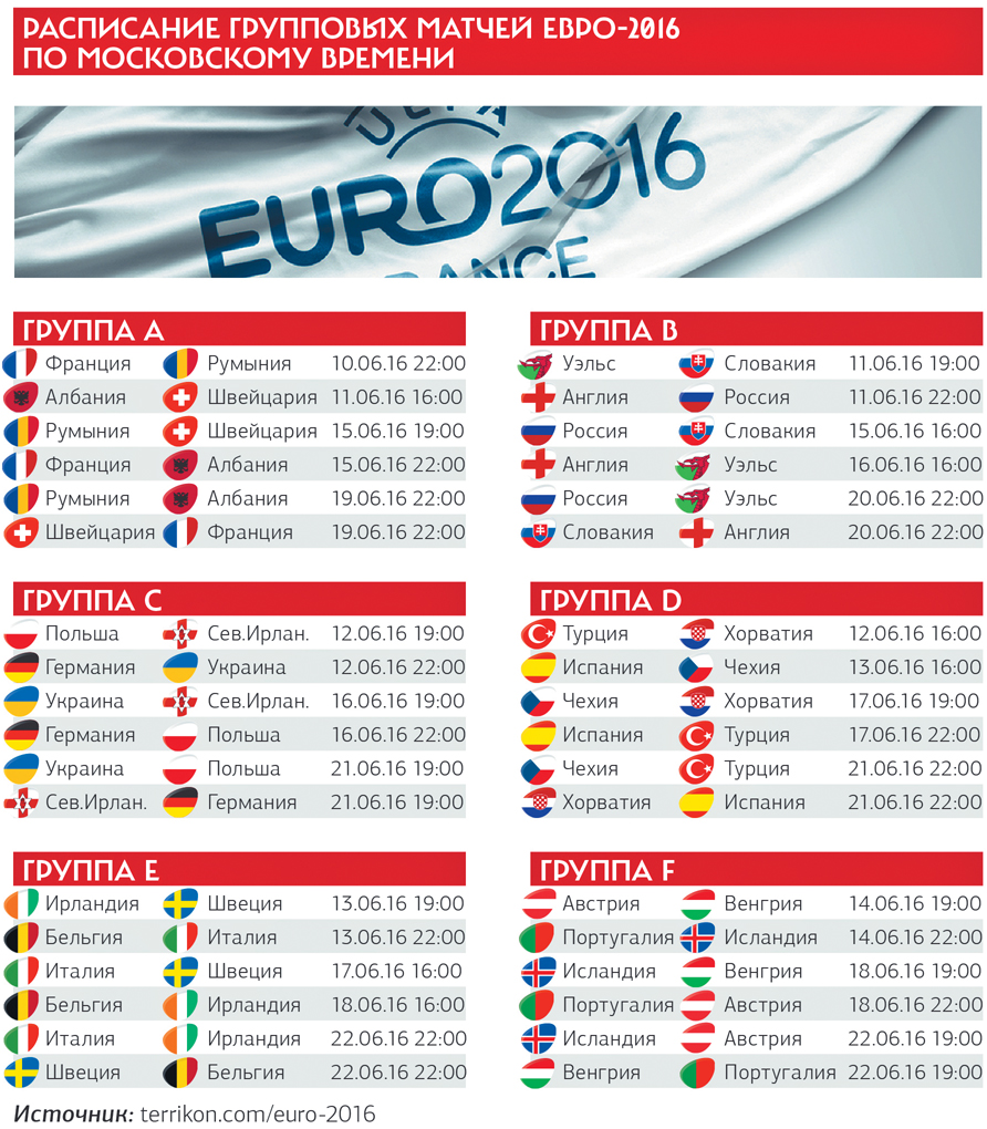 Соперниками нашей сборной на групповом этапе станут команды Англии, Словакии и Уэльса. Сборная России имеет все шансы для выхода в четвертьфинал, однако «основной целью» сборной министр спорта РФ и президент РФС Виталий Мутко назвал успешное выступление в групповом этапе с выходом в плей-офф. Напомним, что начиная с этого года введена новая система проведения чемпионатов Европы: теперь в турнире участвуют 24 команды, а не 16, как раньше. Команды распределены по 6 группам. Для прохождения в следующий этап турнира необходимо занять первое или второе место в своей группе, или войти в четверку лучших команд среди занявших третье место в группе. То есть гипотетических шансов на успех прибавилось у всех.