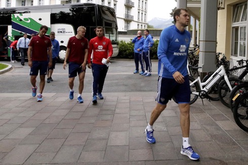 Игроки сборной России Артем Дзюба (на первом плане), Роман Широков, Игорь Смольников и главный врач сборной Эдуард Безуглов (слева направо на втором плане)* после тренировки в преддверии Евро-2016, Бад Рагац, Швейцария, 29 мая 2016 года*