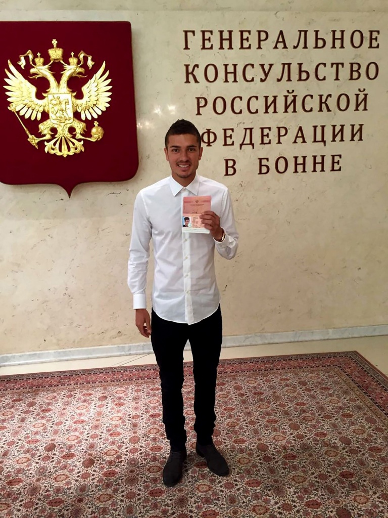 Игрок сборной России Роман Нойштедтер с только что полученным российским паспортом в Генконсульстве РФ,Бонн, ФРГ, 30 мая 2016 года