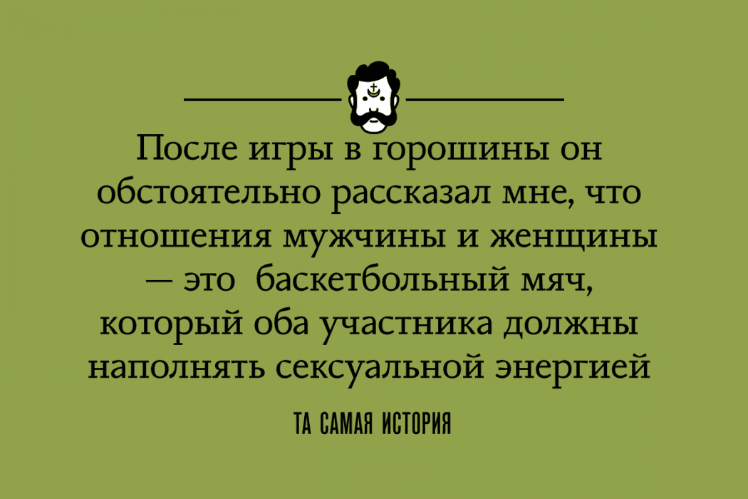 После поглаживания, которое я всеми силами пыталась пресечь, он решил поиграть со мной в какую-то словесно-мысленную игру. Я очень старалась выразить свой отказ как можно вежливее, в результате чего он, видимо, так и не понял, что это вообще-то был отказ. Игра заключалась в том, что он мысленно передавал мне горошины с позитивными эмоциями и просил, чтобы я перезаряжала их и передала ему в ответ. Я так и не поняла, что это было — особый братиславский пикап или просто мой приятель немного чокнутый, но после игры в горошины он обстоятельно рассказал мне, что отношения мужчины и женщины — это большой баскетбольный мяч, который оба участника должны наполнять сексуальной энергией.