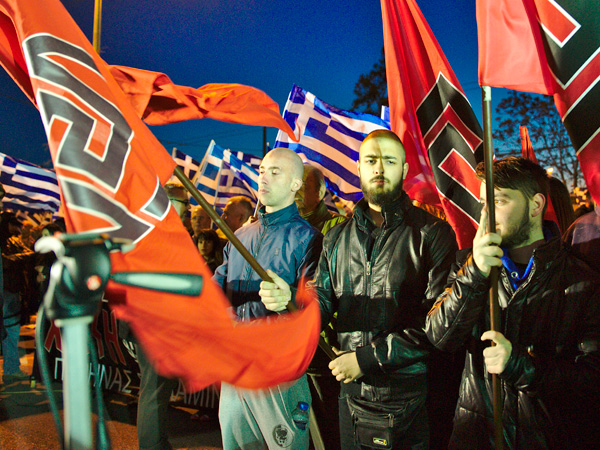 Греческая партия "Золотая заря". wikipedia.orgОпрос показал, пишет Bloomberg, что скепсис по отношению к проекту европейской интеграции простирается далеко за пределы Британии, традиционно державшейся особняком относительно других стран блока. Теперь разочарование демонстрируют все страны начиная с Италии и Польши заканчивая Грецией и Швецией. Во Франции, одной из шести стран-основательниц, уровень доверия к проекту ЕС по итогам долгового и миграционного кризисов оказался еще ниже, чем в Британии.