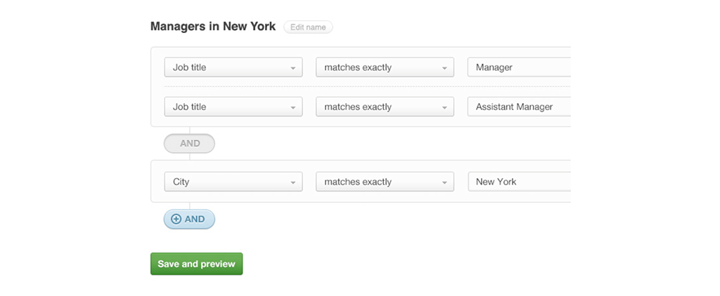 На этом примере видно, как вы можете создать сегмент, включающий менеджеров в Нью-Йорке, по таким параметрам, как название должности и город.