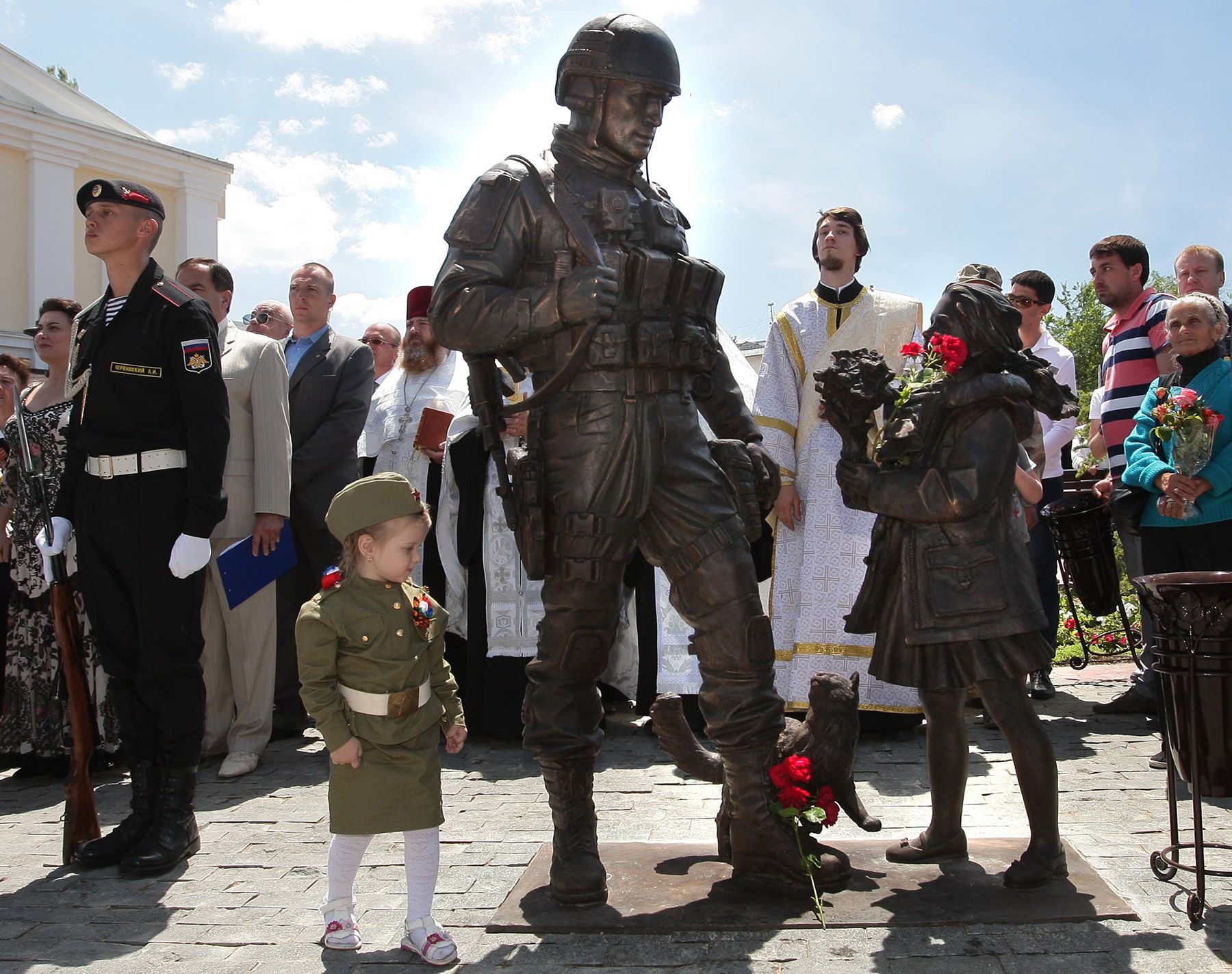 Фото: Тарас Литвиненко / Sputnik / Scanpix / LETA Памятник «вежливым людям» — российским военным, появившимся в Крыму перед референдумом о присоединении полуострова к России, — открыли в Симферополе. Монумент выполнен из бронзы. Его стоимость оценивается в пять миллионов рублей, собранных на пожертвования жителей.