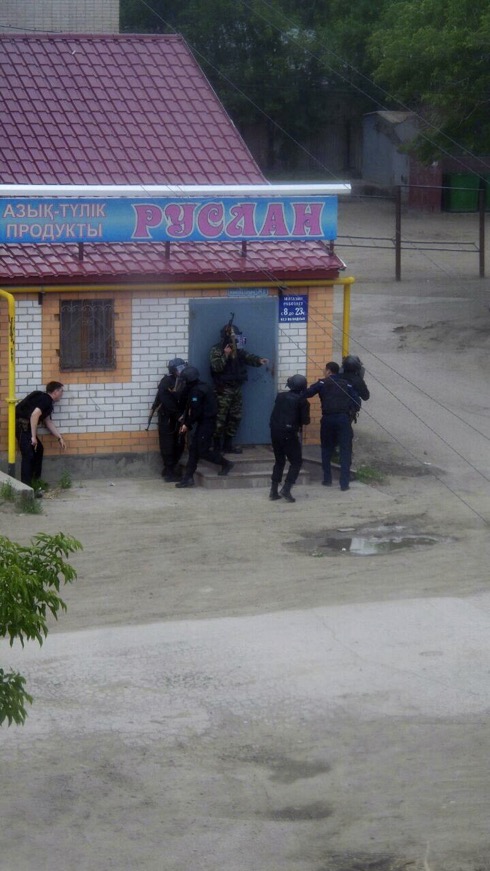 Спецназ штурмует магазин, где скрылись боевики, Актобе, Казахстан, 5 июня 2016 года