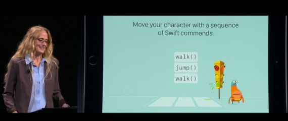 На сцене Тим Кук. Рассказывает про язык программирования Swift, созданный Apple.