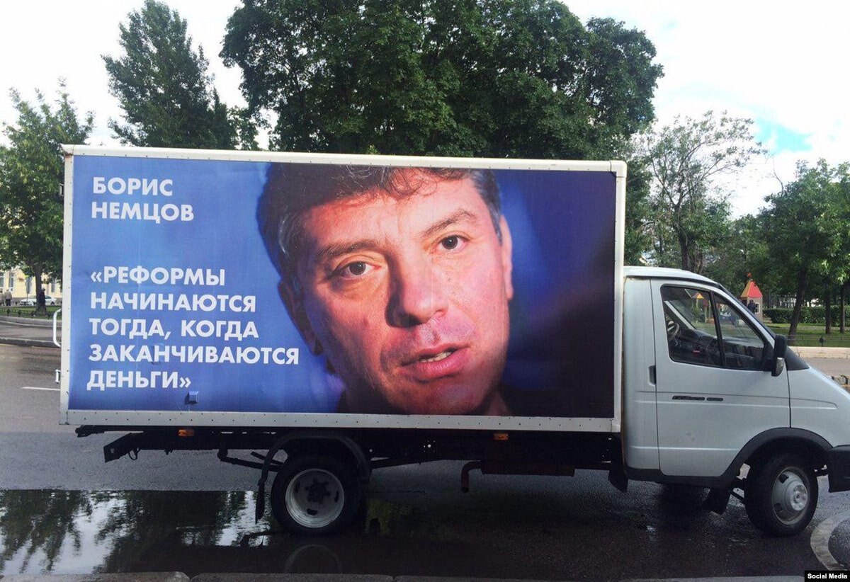 Вероятно, речь идет об автомобиле, изображение которого ранее появилось соцсетях – на снимке видно, что на борту ГАЗели рядом с изображением Немцова написано: "Реформы начинаются тогда, когда заканчиваются деньги".