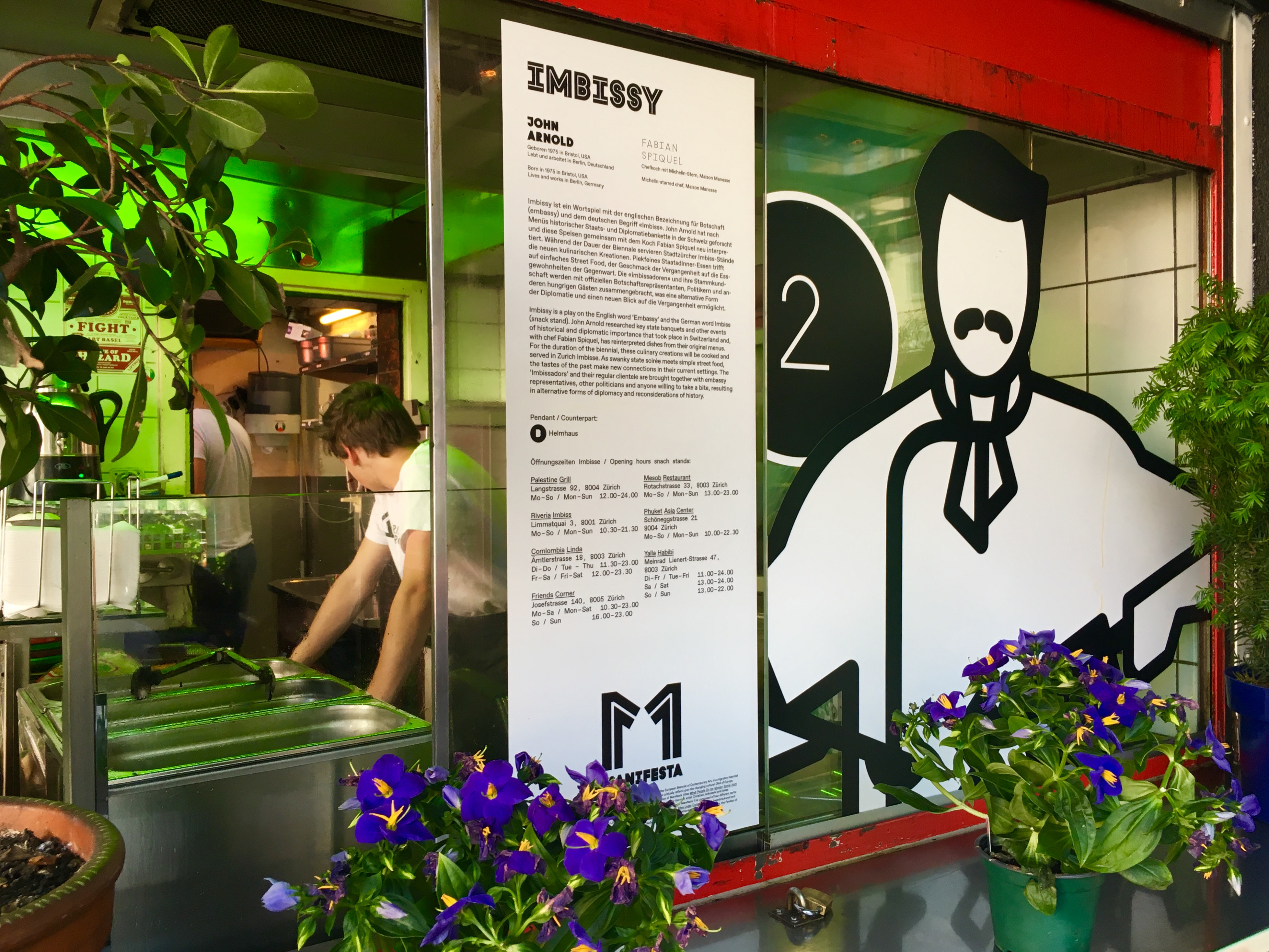 В этом же квартале, на Лангштрассе, несколько заведений фастфуда, которые художник Джон Арнольд использовал для своего проекта Imbissy: скромные закусочные будут предлагать посетителям кушанья из роскошных меню государственных приемов и банкетов. Не знаю, как Арнольду удалось повенчать Еmbassy и Imbiss: когда я уезжал из Цюриха, готовить еще не начали, но один из таких гурманских киосков под названием "Палестина-гриль" я сфотографировал.