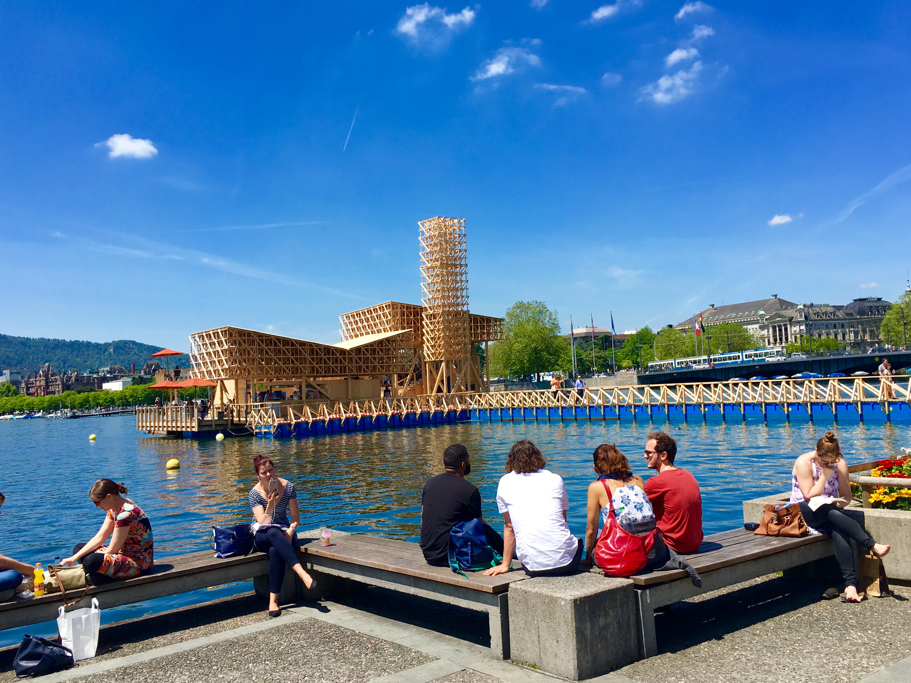 "Павильон отражений" специально построен для "Манифесты" на цюрихском озере: тут показывают фильмы, а самый именитый участник выставки Маурицио Каттелан и паралимпийская чемпионка Эдит Хункелер устраивают перформанс с инвалидной коляской.