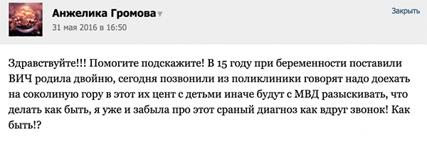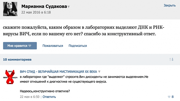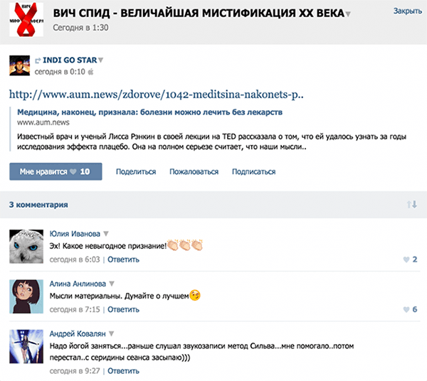 С людьми, которые всё-таки умерли от СПИДа, поступают не совсем честно — их комментарии удаляют и выставляют всё так, будто бы они начали приём терапии, и именно это привело к смерти. Многих достаточно сложно отследить, потому что мало кто сидит в группе под реальными аккаунтами. В какой-то момент человек просто перестал заходить в интернет.
