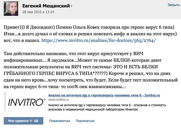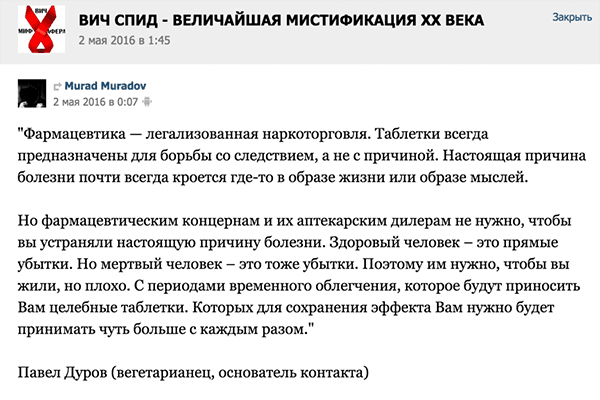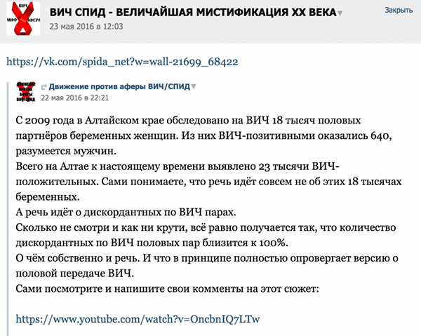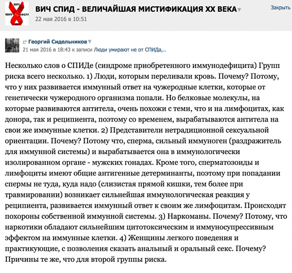 В общем, казалось бы, ничего страшного в жизни с ВИЧ нет: принимай терапию, соблюдай указания врача, живи долго и счастливо, однако в указанной мной группе на момент написания текста было четырнадцать тысяч шестьсот пятьдесят семь участников, считающих себя ВИЧ-диссидентами. Они сплотились вокруг идеи, что ВИЧ — это мистификация и заговор фарм-компаний. Вич-диссидентство — неоднородное движение, часть его отрицает существование ВИЧ в принципе, но признаёт существование СПИДа, просто, по их мнению, СПИД был вызван другими причинами; другая часть говорит, что и СПИДа нет, а третья группа считает, что ВИЧ существует и это просто вирус-путешественник, который есть у всех. Этих людей объединяет одно: они считают, что вся история с ВИЧ — это теория заговора, и активно пропагандируют отказ от терапии, наблюдения, посещения СПИД-центра и всяких мер предосторожности, связанных с ВИЧ-положительным статусом (например, не считают нужным сообщать новому партнеру, что у тебя есть ВИЧ, перед сексом).