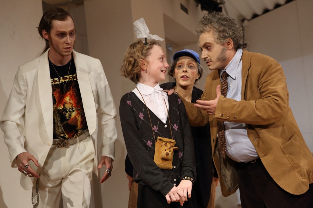 «Онегина» «своими словами» пересказывают четыре персонажа, по типу комедии дель арте: русская (Анна Синякина), француженка (Наталья Горчакова), чех (Сергей Мелконян) и финн (Максим Маминов). Почему именно чех и финн — не спрашивайте, науке это неизвестно. Однако очевидно, что актеры играют именно тех, кого задумали, — безупречный акцент каждого иностранца отсылает именно к указанной национальной принадлежности и придает русскому слову небывалую грандиозность и многоплановость. Четыре персонажа по ходу действия разыгрывают пьесу не по ролям, а по смыслам — словно отвечая на привычный и самый противный «школьный» вопрос: что хотел сказать автор?