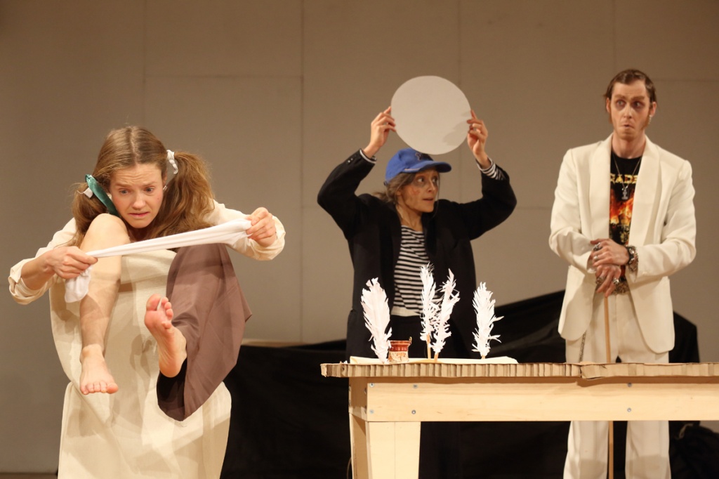 Персонажи спектакля (Максим Маминов, Наталья Горчакова и Сергей Мелконян) распределяют роли для зрителей