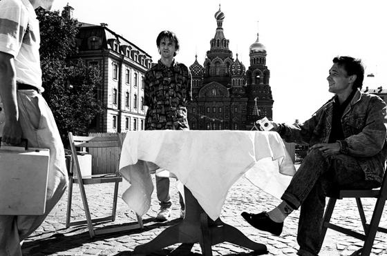 — В Манеже шла биеннале современного искусства (речь идет о Фестивале экспериментальных искусств и перформансов, который проводился в Санкт-Петербурге в Манеже каждые два года с 1994 по 2008 год. — Ред.). Я тогда работал дворником и забрал из одной квартиры, где умерла бабушка, комплект белых слоников и круглый рижский стол на одной ноге. Слоников я потом раздарил, а стол долго стоял у меня в комнате в Манежном переулке. Я подумал: отлично — можно совершить поход от Манежного переулка до Манежа вместе со столом и раскладными стульями, по пути останавливаться, садиться за стол и говорить об искусстве. Так мы и сделали. Все наши разговоры Спирихин фиксировал на печатной машинке. Потом, кстати, зажилил все эти тексты: их никто так и не видел. Мы вышли из квартиры, вынесли стол, накрытый скатертью, уселись. Спирихин начал печатать, я — снимать. Потом вышли на улицу Маяковского, остановились, сели. К нам подошел милиционер, но не при исполнении: ему просто интересно было, что мы делали. Странно же: люди сидят за столом на Маяковской. Потом к Преображенскому собору подошли, сели на площади. Флягин, Спирихин и Панин пили пиво и говорили.