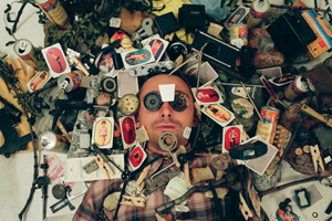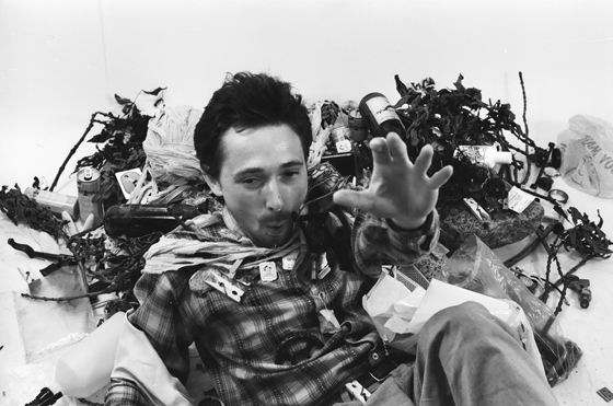 — Когда я решил отказаться от участия в перформансах «Тупых», Флягин пытался втянуть меня обратно: приходил ко мне в студию, садился и уговаривал. «Камуфляж» и «Сэндвич» родились во время его визитов. Я тогда собирал много всякого хлама для съемки: веревки, чайные пакетики, булыжники с Финского залива. Камуфляж — это же маскировка. И я придумал такую мусорную маскировку. Моя дворническая практика сказалась. Я уложил Флягина на пол и завалил всем этим хламом. А потом «Камуфляж» перерос в «Сэндвич», который мы устроили уже в галерее. Это было посвящение художнику Толстому, он тогда уже жил во Франции и иногда приезжал сюда. Толстый сидел в кресле, как король, и комментировал происходящее. Мы расстелили брезент, уложили Флягина, засыпали моим добром, завернули в одеяло и вытащили из галереи, как мусор. «Сэндвич» — это вообще фотографический термин, который означает наслаивание изображений друг на друга.