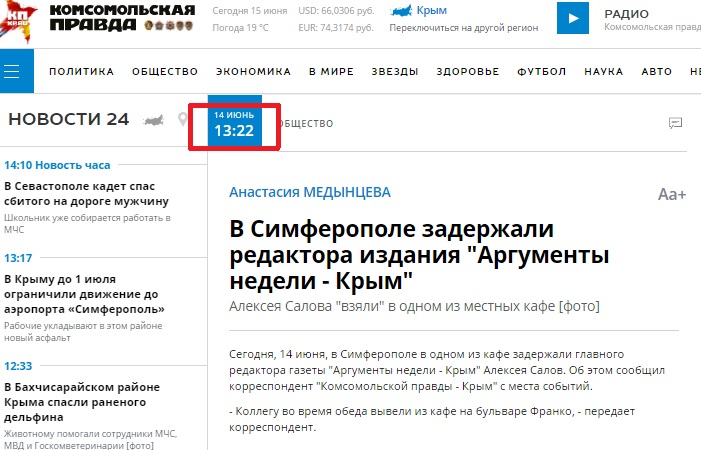 В Симферополе 14 июня был задержан шеф-редактор интернет-издания «Аргументы недели – Крым» Алексей Салов. Представители правоохранительных органов увели его в наручниках из кафе в центре города. Спустя сутки после его ареста по-прежнему неизвестно, в рамках какого дела он задержан и что конкретно ему инкриминируется. В то же время некоторые факты, обнародованные в крымских СМИ на эту тему, требуют уточнений.