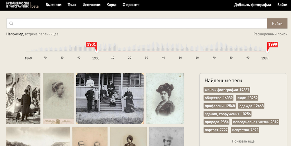 Мультимедиа Арт Музей запустил проект по созданию единого фотоархива страны. На сайте проекта «История России в фотографиях» уже собрано более 70 тысяч снимков, самый ранний из которых датирован 1860 годом, а самый поздний — 1999-м. На данный момент представлены фотографии из 112 музеев и частных коллекций. Все кадры подписаны и распределены по темам, авторам и датам. Есть возможность добавления геотегов и просмотра фото на карте. Пользователи сайта сами могут создавать онлайн-выставки, дополняя коллекцию кадрами из домашнего архива или собирая уже размещенные на сайте фотографии. По задумке авторов проекта, такой подход позволит как можно большему числу людей поделиться своими личными рассказами и переживаниями, из которых и составляется в конечном итоге история страны.