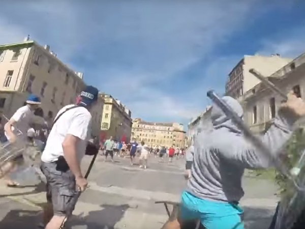 На сайтах ряда СМИ появилась видеозапись столкновений между болельщиками сборных России и Англии во французском городе Марселе, произошедших в минувшую субботу. Видео снимал с помощью камеры GoPro один из российских футбольных фанатов, который лично участвовал в драках.