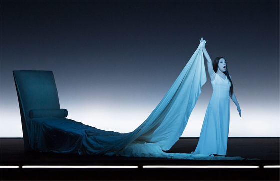 Создатели того и другого — перфекционисты. Уилсон — это, в первую очередь, инопланетная пустота сцены с немногочисленными загадочными кристаллическими объектами и световая партитура, которой эмоции позволительны больше, чем персонажам с набеленными лицами и жестко прописанными кукольными позами и движениями. Индивидуальные штрихи — редкие, запоминающиеся и ни в коем случае не связанные напрямую с текстом либретто. Конечно, до чахоточного кашля в своем условном мире Уилсон не опускается: Виолетта сообщает о своем нездоровье, резко складываясь вбок каким-то нырятельным движением. А уличный карнавал за окном умирающей пляшет исключительно с помощью гибкой кисти ее руки в белой перчатке в луче света.