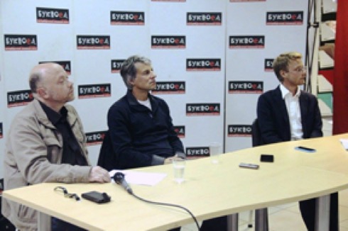 Участники дискуссии в «Буквоеде» (слева направо): Дмитрий Травин, Вадим Волков, Александр Кондаков, Санкт-Петербург, 7 июня 2016 года