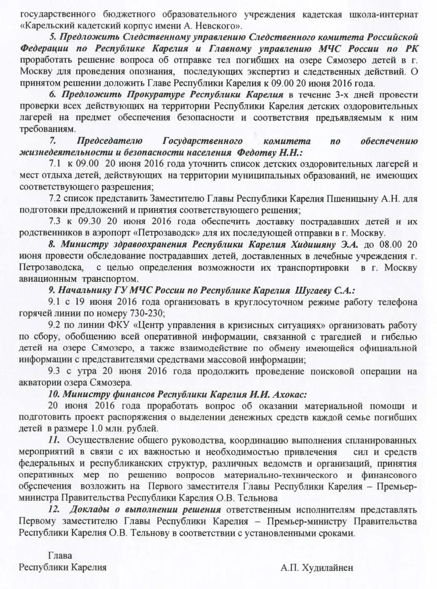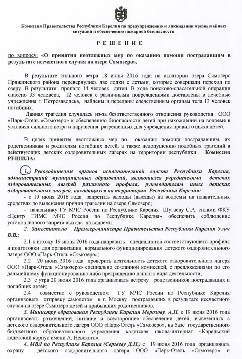 Эта комиссия собралась на экстренное совещание сразу, как только стало известно о гибели 14 детей в лагере «Парк-отель «Сямозеро». В решении, вынесенном по итогам заседания комиссии, первым же пунктом прописан запрет с 19 июня на «…выходы (выезды) на водоемы на плавательных средствах до выяснения причин трагедии на озере Сямозеро», обеспечить выполнение этого запрета поручено начальнику управления МЧС Карелии.