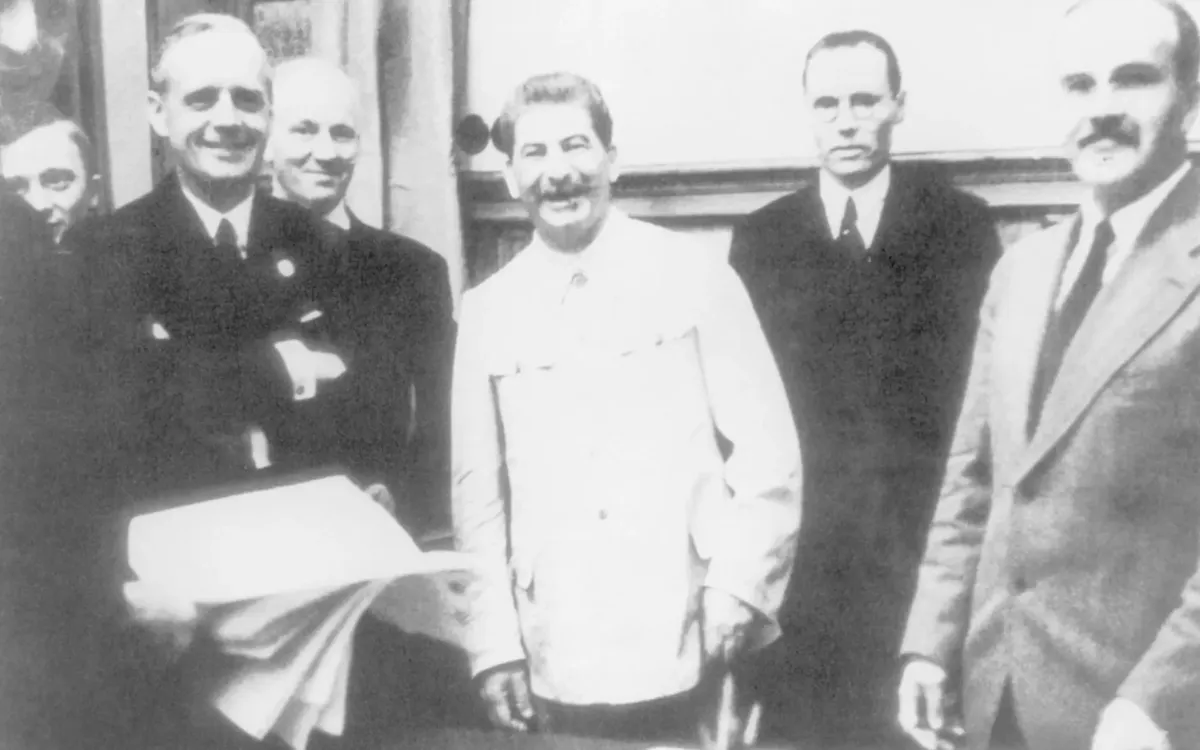 Поэтому Советским Союзом одновременно велись переговоры и с немцами, и с англо-французами, и в итоге в ночь с 23 на 24 августа в Москве Риббентропом и Сталиным был подписан Пакт и секретное приложение к нему. Причем именно Сталин настаивал, чтобы Пакт не мог вступить в силу без подписания секретного приложения. А секретное приложение — это был план раздела Центральной Европы между Германией и СССР: делилась Польша; Прибалтика, Финляндия и Бессарабия отходили в зону советского влияния.